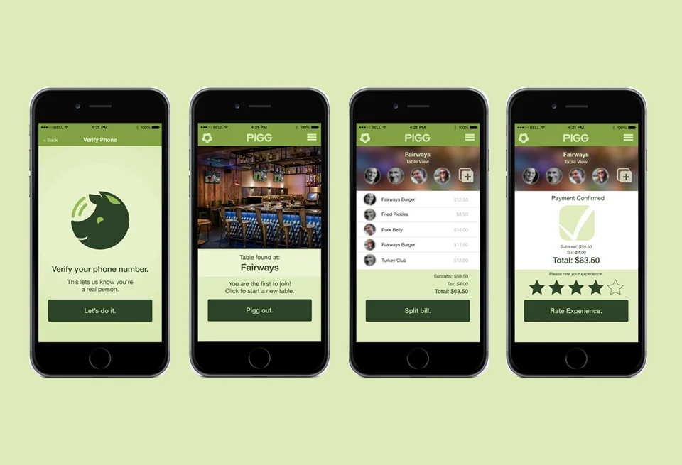 A mobile payment app that allows customers to pay their bill and/or split the check & simply rate their experience. What's different about Pigg is that it's proximity based via beacons, table-side and throughout the space; so no need to contact a waiter before closing the tab.